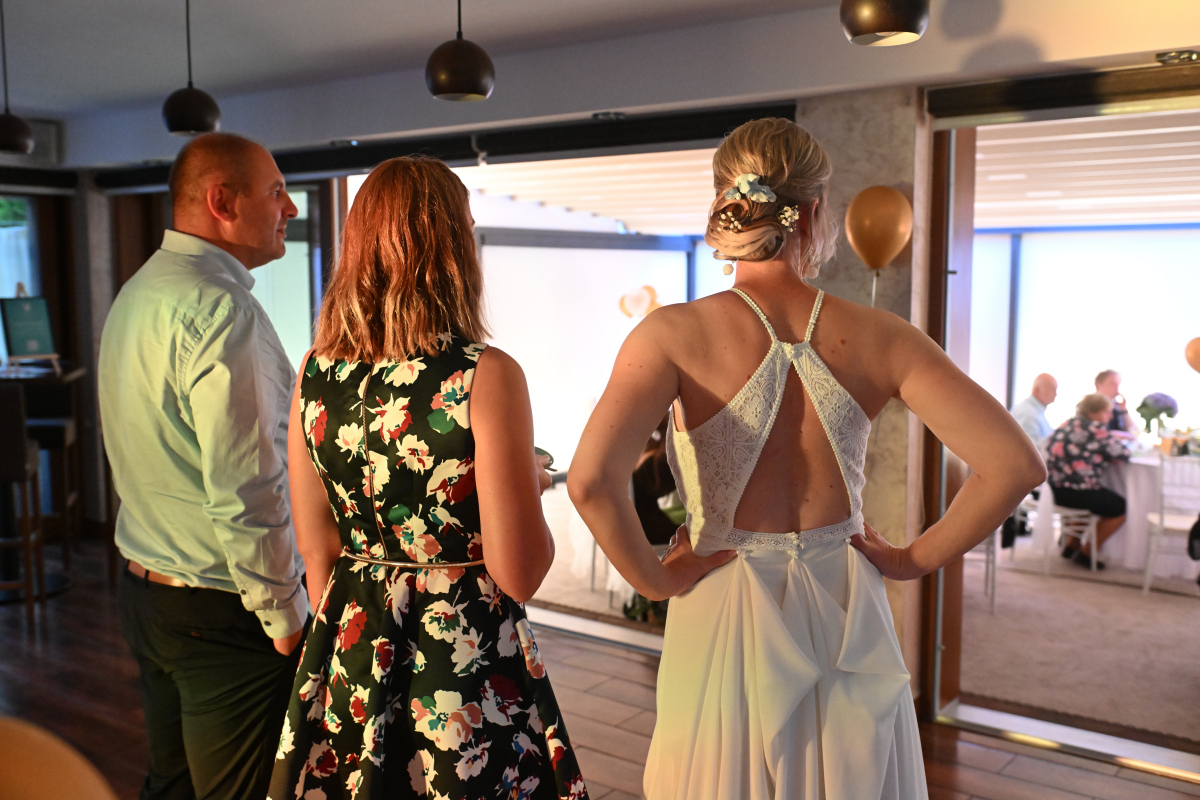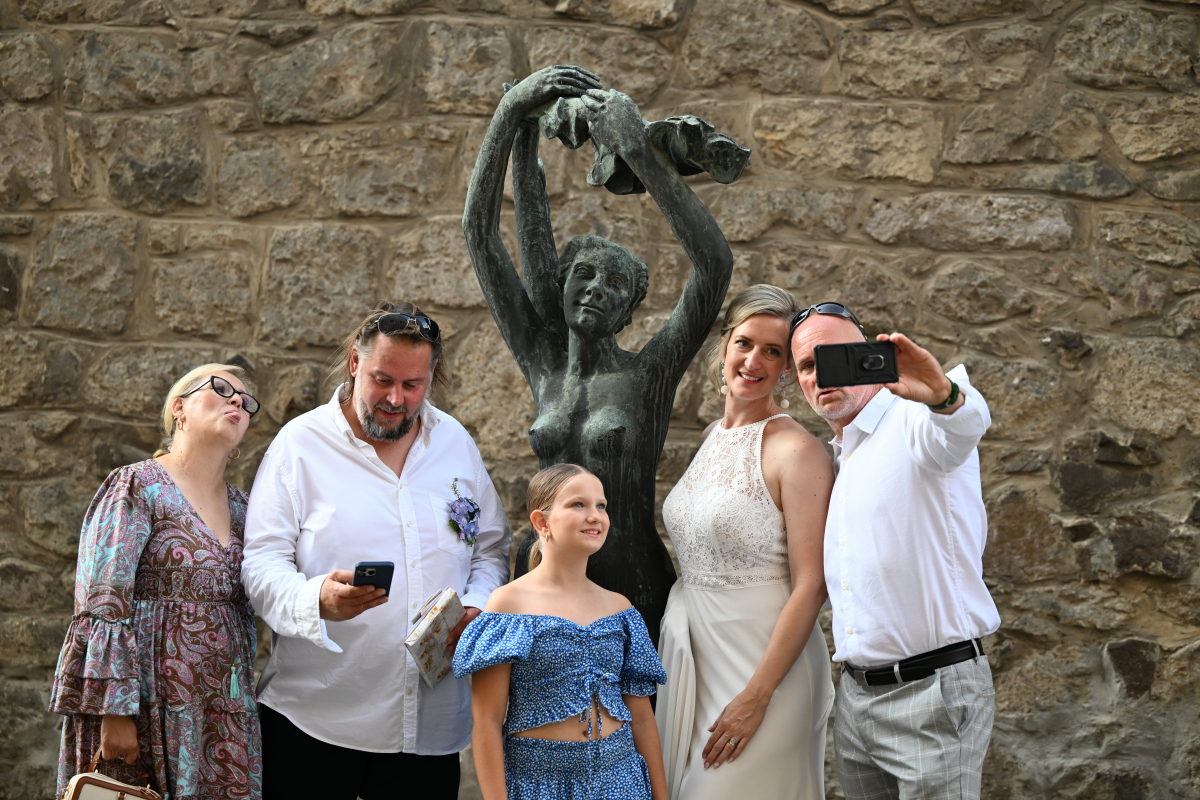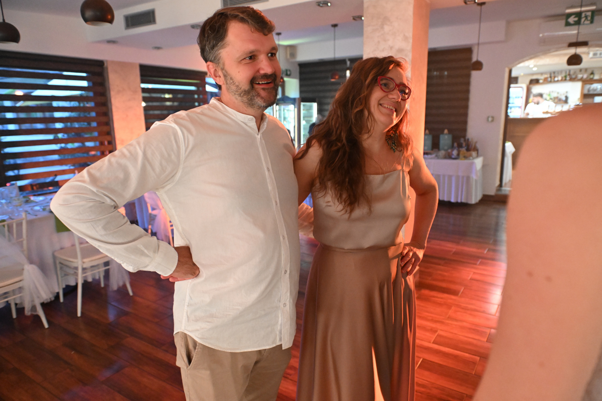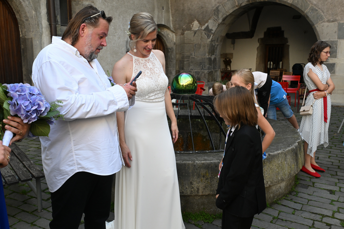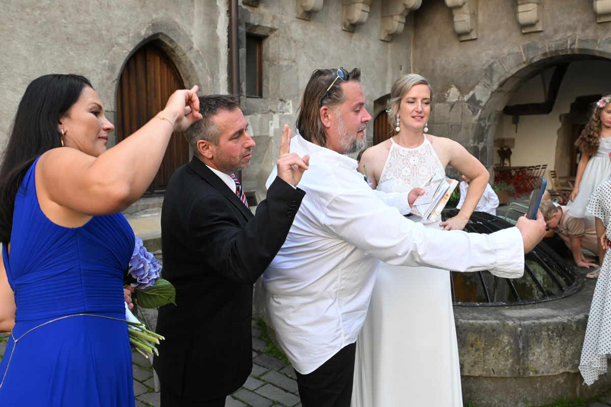 Fotografovanie sa vo fotokútiku s novomanželmi.